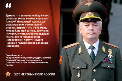 Мне кажется, что к Навальному слишком лояльное отношение у нашего общества и у судебно-правовой системы — как к какому-то неразумному ребенку, который может еще исправиться. Годов ему много, образование он получил, а какую пользу стране принес, кроме гадостей? Никакой. И это заслуживает серьезного наказания. Думаю, что это должно быть тюремное заключение, а не денежный штраф», — считает генерал-полковник, кавалер ордена Святого Георгия IV степени, сопредседатель Центрального штаба Бессмертного полка России Сергей Макаров.