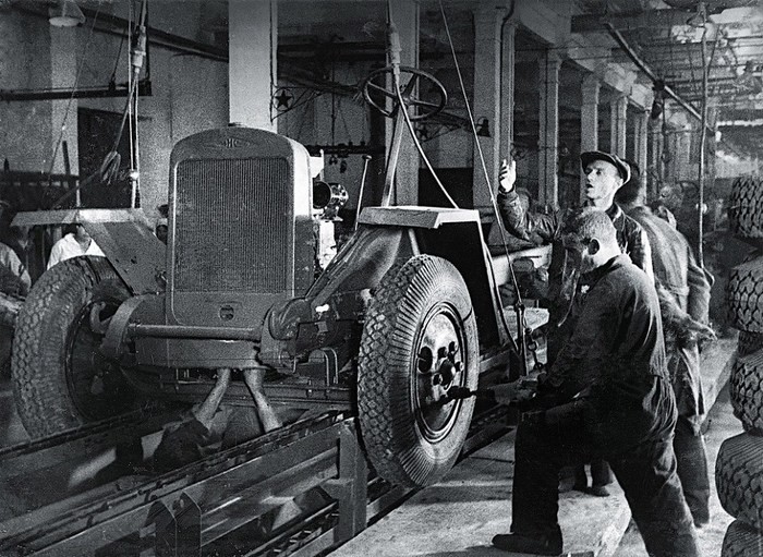 На фото: Автозавод (с 14 февраля 1943 г. Уральский автомобильный). Сборка первых автомобилей «ЗИС—5В» (трехтонка).