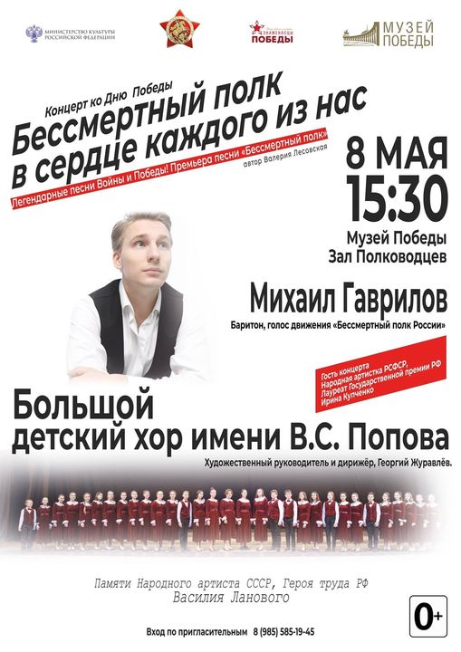 🎶 В концерте прозвучат произведения о Великой Отечественной войне в исполнении Народной артистки России Ирины Купченко, солиста крупнейших отечественных и зарубежных музыкальных коллективов, музыкального эксперта на телеканале «Россия1» Михаила Гаврилова, Большого детского хора имени В.С. Попова.