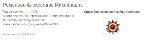 Ей было 22 года, когда началась война. Медсестричкой ушла на фронт. Она воевала в 1251 стрелковом полку 377 стрелковой дивизии. Эта дивизия сформирована в сентябре 1941 года в Чебаркуле Приказом НКО от 11 сентября 1941 года. Первоначально была зачислена в состав 39-й армии (с середины декабря 1941 года Калининского фронта), но была через Пермь — Киров — Вологду направлена к Волхову (военное везение, ибо вся 39-я армия погибла под Ржевом в окружении). Однажды Михаилу Сидоровичу (отцу Александры) пришло письмо от бойцов, которых она вынесла на себе из горящего танка. Они благодарили его за то, что воспитал такую дочь! О её бесстрашии и отваге, во время боев, говорят награды, которых Александра была удостоена: Орден Красной Звезды и медаль «За боевые заслуги»! Это значит, что за один бой она вынесла 25 или более человек, а за второй — 15! 25 тяжёлых мужиков под арт-огнём, причём вместе с оружием (за бойца, вынесенного без личного оружия могли и расстрелять, чтоб другим не повадно было!) в 22 года. Этого не поймёт никто, кроме тех кто попробовал отволочь хоть одного человека, хотя бы даже и без опасности для жизни. У меня нет слов просто!