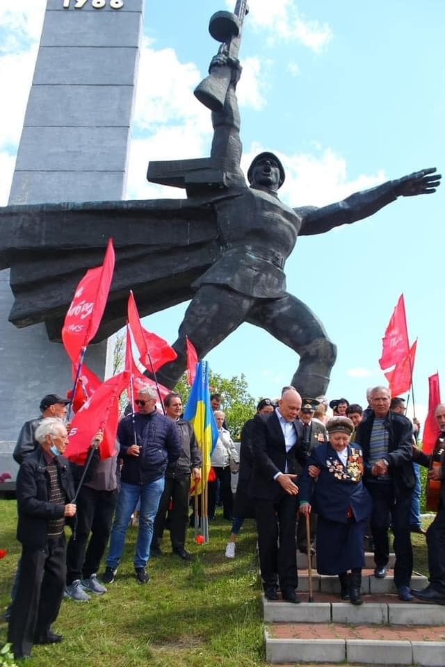 Там ветераны Великой Отечественной войны, среди которых была местная знаменитость — ветеран Великой Отечественной Александра Семеновна Скрипнюк, которая начала свой боевой путь от Сталинграда молоденькой медсестрой, выносившей с поля боя воинов, а потом всю жизнь лечившая детей, возложили к подножью памятника цветы.»
