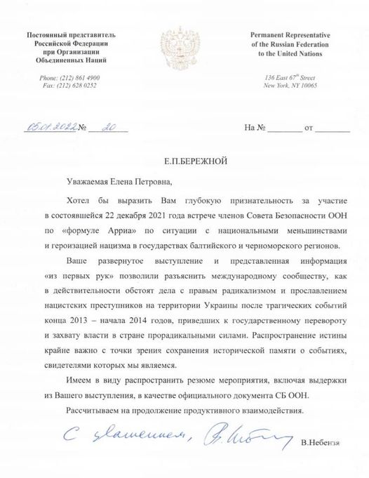Друзья ! Не ожидала такой оценки ! Постоянный представитель Российской Федерации при ООН Василий Алексеевич Небензя поблагодарил меня за выступление на расширенном заседание Совета Безопасности ООН 22 декабря