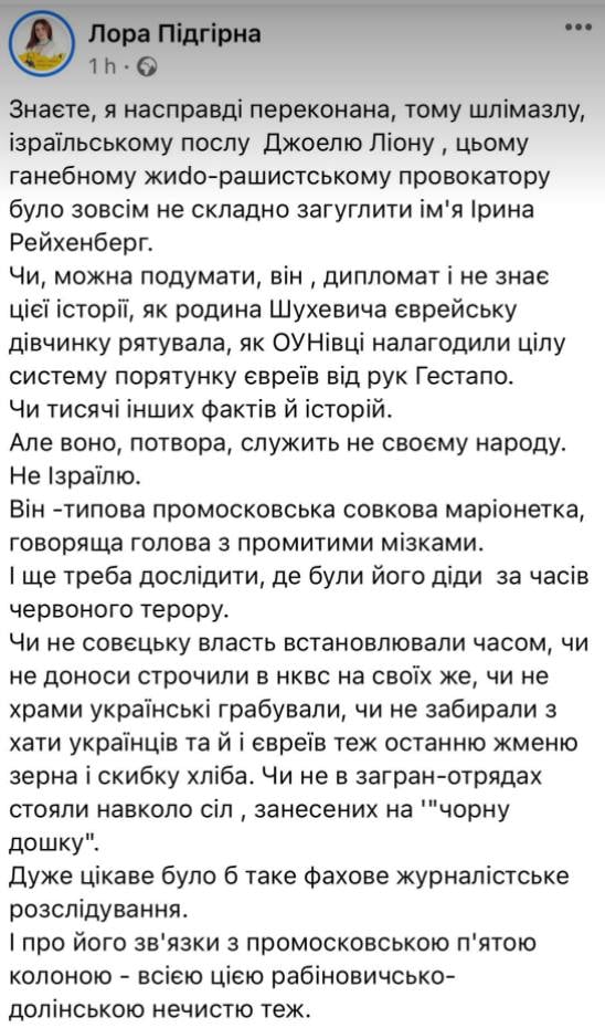 Посла Израиля в Украине Лора назвала «ж_до-рашистским провокатором, уродом, промосковской совковой марионеткой, говорящей головой с промытыми мозгами» и потребовала проверить, где были деды посла, не устанавливали ли они советскую власть и не забирали ли хлеб у украинцев.