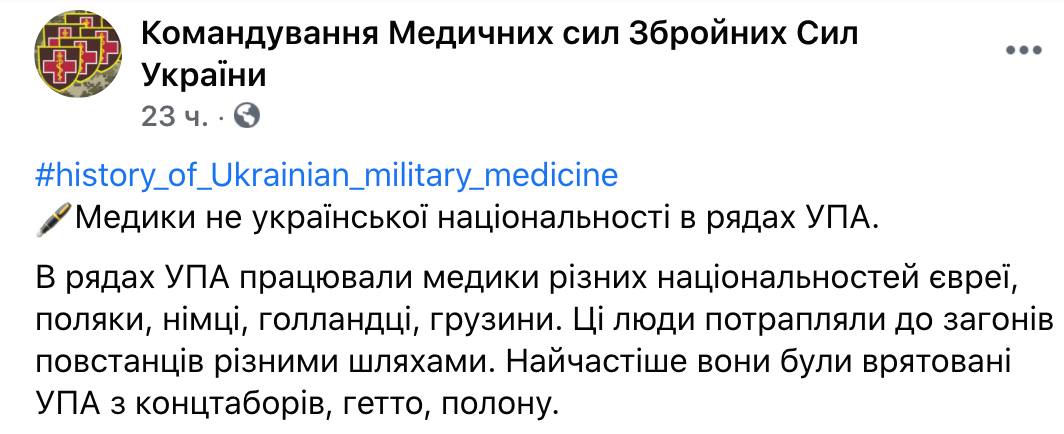 Командование медицинских сил ВСУ сообщает о подвиге еврейских, голландских и польских врачей в УПА. Еврейских врачей УПА освобождала из гетто и концлагерей, а те, в свою очередь, с пулеметом в руках, до