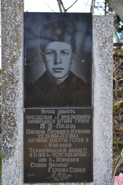 Памятник нацистскому военному преступнику Васылю Процюку. С 1941 года член ОУН Васыль Процюк служит у нацистов в управе Шепетовки, занимается организацией украинской вспомогательной полиции, выявлением евреев и