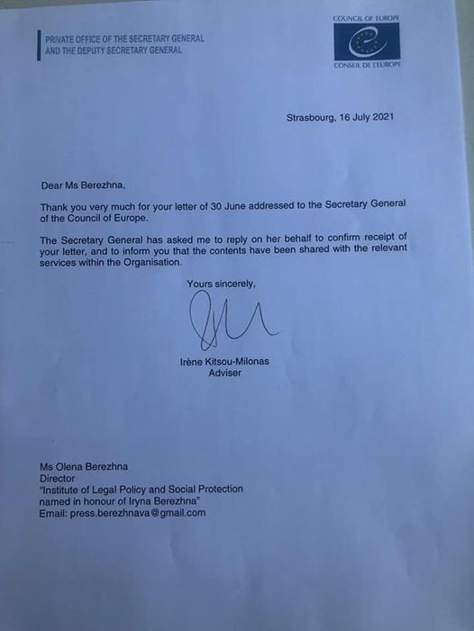 Друзья ! Институт правовой политики и социальной защиты имени Ирины Бережной получил ответ Генерального Секретаря Совета Европы на обращение Института по беспредельному законопроекту о национальных меньшинствах Многие ходят по телеканалам, произносят правильные фразы, но реально не помогли не одному человеку , даже не пытаются что- либо изменить в стране ! Однако — они лидеры общественного мнения ! Институт продолжает благие дела Ирины Бережной и защищает права и свободы наших граждан ! Добиваемся направление геноцидного законопроекта о национальных меньшинствах на экспертизу в Венецианскую Комиссию ! Международным структурам надо показывать беспредел власти в Украине !!!!