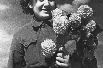Портрет советской девушки-военнослужащей Юго-Западного фронта с букетом цветов. Май 1942 г.