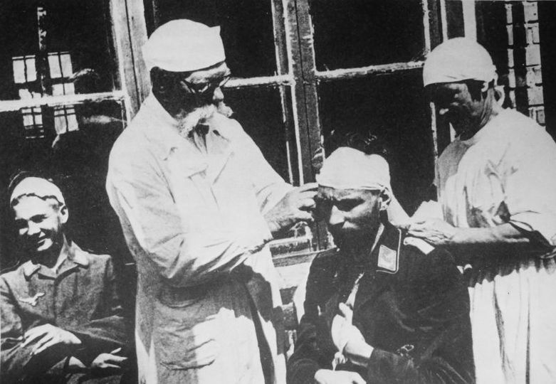 Доктор Е.И. Невирович и медсестра В.П. Васильева перевязывают раненого пленного летчика Люфтваффе (предположительно в звании лейтенанта) Эрнста Рестца. 20 июля 1941 г.