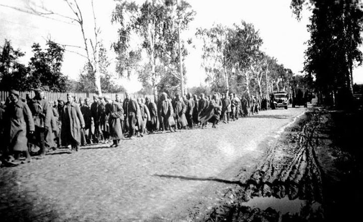 Колонна советских военнопленных. В центре бегущий солдат — возможно, пытается сбежать.