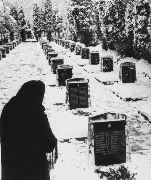 Автор фотографии — Евгений Халдей. Фотография сделана в 1957 году у братских могил на Востряковском кладбище в Москве.