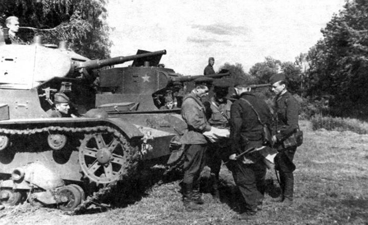 Последние указания перед боем. Подразделение советских легких танков Т-26 в окрестностях Сталинграда. Юго-Западный фронт, 1942 г.