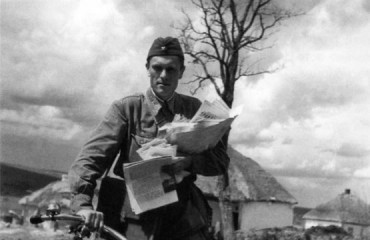 Женщина наклеивает на доску объявлений плакат «Родина-мать зовёт!». Знаменитый плакат времён Великой Отечественной войны был создан художником Ираклием Тоидзе в конце июня 1941 года.