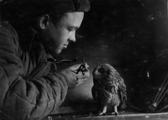 Боец взвода фоторазведки 796-го отдельного разведывательного артиллерийского дивизиона рядовой Василий Михайлович Арзамасцев кормит своего питомца — совенка.