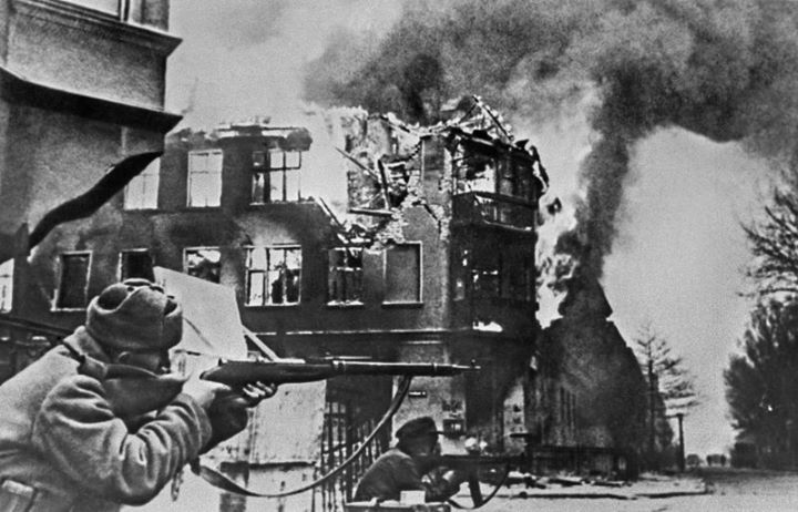Советские солдаты в уличных боях за Кенигсберг. Восточная Пруссия, Германия. Апрель 1945 года.