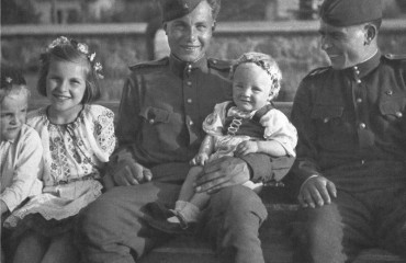Сын полка с велосипедом на фоне автомобильной техники. Торгау, Германия, апрель 1945 г.