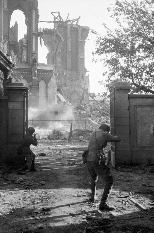 Советские солдаты ведут бой на у руин взорванного Кафедрального Собора Святого Михаила Архангела и Святого Флориана (Bazylika Świętych Michała i Floriana, современный адрес ulica Floriańska 3) в Варшаве. Собор был взорван немцами в сентябре 1944 года после Варшавского восстания.1944 год.