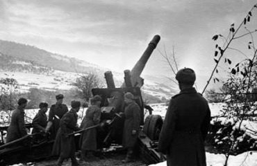 Вид на Рейхстаг после окончания военных действий. На переднем плане немецкое зенитное орудие 8,8 cm FlaK 36. На заднем плане жители города и американский грузовик «Студебеккер».