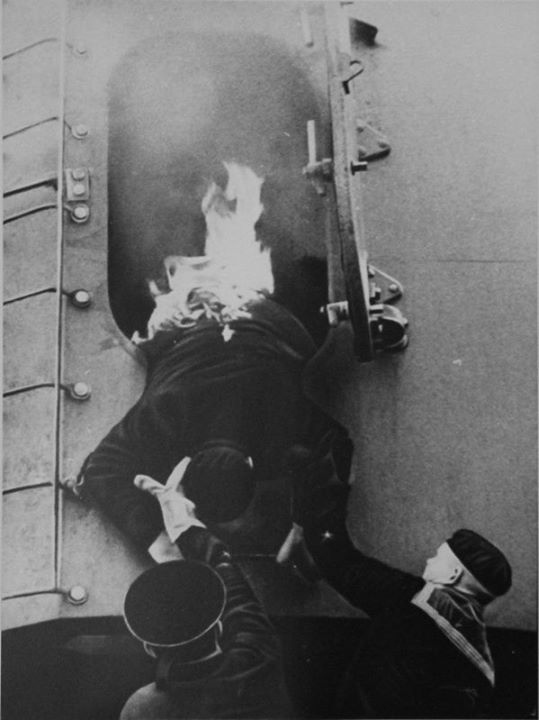 Матросы крейсера «Красный Кавказ» достают горящего башенного комендора краснофлотца Василия Матвеевича Покутного.