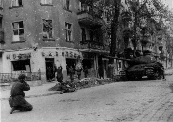 Немецкие солдаты сдаются в плен советским войскам на улице немецкого города. Справа — советский тяжелый танк ИС-2.