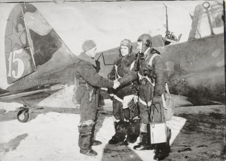 Поздравление комиссаром Зиновием Абрамовичем Лещинером экипажа Су-2М-88Б № 15 — штурмана-стрелка Петра Алексеевича Землякова и летчика, дважды Героя Советского Союза Григория Флегонтовича Сивкова после первого боевого вылета группой из 9 самолетов на бомбардировку танков противника, скопившихся у небольшого населенного пункта вблизи станицы Славянской. Аэродром Буденовка, 3 эскадрилья 210 ББАП.