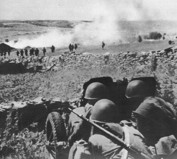Советские артиллеристы поддерживают огнем атакующую пехоту.