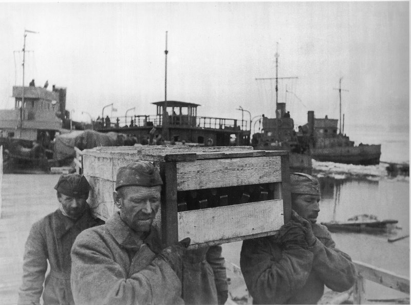 Советские солдаты выгружают ящики с оружием с судов, прошедших Дорогой жизни через Ладожское озеро. 24 мая 1942 года.