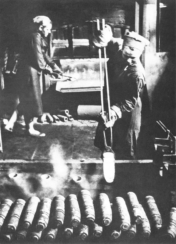 Женщины на производстве снарядов на советском заводе оборонной промышленности.