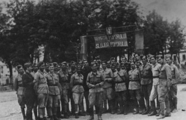 Август 1942 г., Сталинград. Участник обороны Царицына, старейший рабочий тракторного завода (СТЗ) Павел Родионович Золотухин вручает новый танк Т-34-76 танкистам старшего лейтенанта Владимира Хазова. За боевые успехи танкист был награжден орденом Красного Знамени, на его личном счету было 27 уничтоженных танков противника.