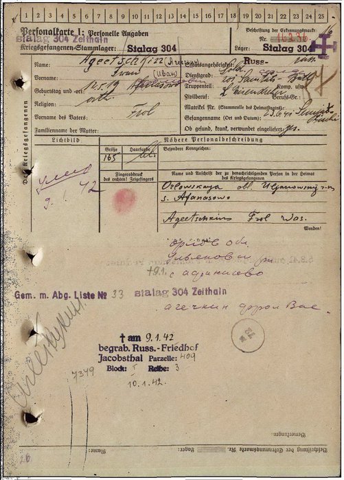 Точнее, двоюродного деда, брата моей бабушки по папиной линии, пропавшего без вести во время Великой Отечественной войны — Агеечкина Ивана Фроловича. В бабушкиной семье было пятеро детей. Пропали без вести оба ее брата — Иван и Василий. Она пыталась искать их всю жизнь, но, увы... Честно говоря, я тоже уже давно была уверена, что найти их нереально. Слишком много лет прошло, а у бабушки не было почти никакой информации о них. О Василии никакой вообще. А Иван, по ее словам, вроде бы закончил какое-то военное училище, получил какое-то невысокое воинское звание, а перед самой войной приезжал к ней в гости в Щелково, где она тогда жила, и сказал, что его отправляют в Белоруссию. Место она тоже запомнила: «Город Минск, Черные дороги». И всё! Судя по всему, пропал он в начале войны, потому что никаких писем ей от него не приходило. Потом, когда после войны она пыталась его найти, то получала лишь отписки: «Пропал без вести»... И еще ей однажды приснился сон. Оба ее брата, оборванные, несчастные, пришли к ней в дом и попросили хлеба. Она побежала на кухню: «Сейчас-сейчас!» А когда вернулась, увидела лишь их спины, они медленно шли куда-то в даль, в пустоту... Бабушка почему-то была уверена, что Иван и Василий попали в плен и остались в Германии или где-то еще за границей. Сначала тревожилась, ведь могли бы прислать весточку. А потом уверилась в том, что они погибли... Ох, как же она оказалась близка к истине. Совершенно случайно 5 лет назад я попала на сайт ОБД «Мемориал»: http://obd-memorial.ru/html/default.htm Увы, раньше я о нем не слышала. Всего лишь вбила фамилию, имя и отчество Ивана (а больше я и ничего не знала о нем) и... В общем, друзья, это уже потом я сидела и подробно изучала полученную информацию, углублялась в детали, искала статьи. А тогда мне хватило нескольких минут, чтобы узнать, что Иван действительно попал в плен, был увезен в Германию в концлагерь Шталаг IV B (Н 304) Цайтхайн II и погиб там 9 января 1942 года. Вариантов быть не может: фамилия Агеечкин не особо распространенная, место рождения в документах совпадает, имя и отчество отца — Фрол Васильевич — тоже, а в одном из документов даже указана фамилия матери — Илюшина и крестик напротив: она умерла, когда моей бабушке было 6 лет, а Ивану — 4. + ДОБАВИТЬ ЭТОТ БЛОГ В ДРУЗЬЯ + НАШ ИНСТАГРАМ — о личном и путешествиях