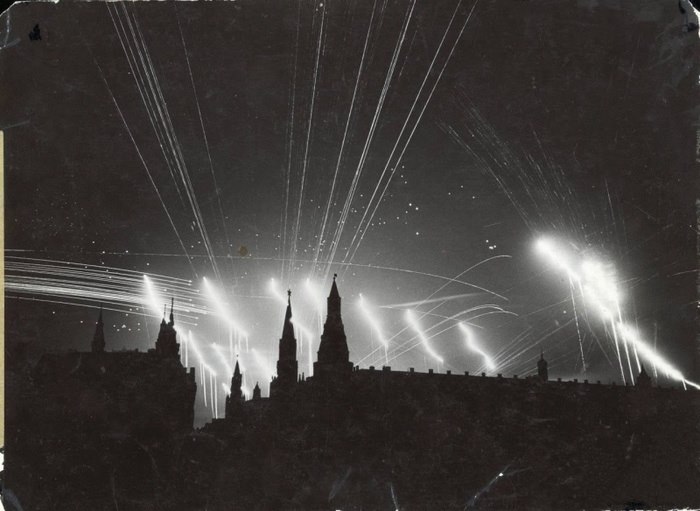 На фото: Налет немецкой авиации на Москву 26 июля 1941 года. Зенитчики бьют по немецким самолетам, сбрасывающим осветительные ракеты (семь ярких следов в небе) на парашютах для подсветки местности и ориентирования бомбардировщиков.