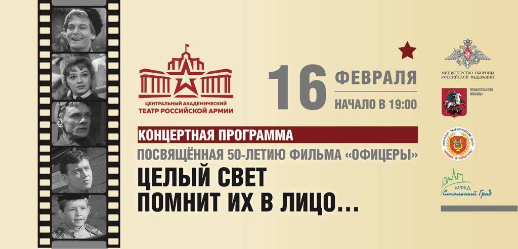 🎫 Юбилейное чествование фильма откроется концертной программой «Целый свет помнит их в лицо» в Центральном академическом театре Российской Армии, которая будет посвящена российским офицерам – от Российской Империи до сегодняшнего дня.