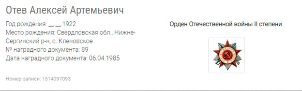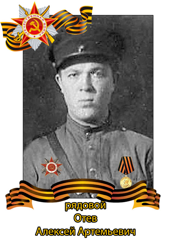Отев Алексей Артемьевич родился в с. Кленовское в 1922 году. В начале 1942 года был призван в действующую армию. Воевал в рядах 8-й гвардейской Панфиловской дивизии рядовым с марта 1942 года по 20.08.1942 года. В зимнем наступлении 1941—1942 годов советские войска нанесли тяжелое поражение захватчикам и отбросили их далеко на запад под Тихвином, Москвой, Ростовом-на-Дону… 7 января 1942 года в наступление на врага перешли войска и Северо-Западного фронта, в ходе которого была окружена 95-тысячная группировка противника. Это было первое окружение столь значительных сил врага с начала Великой Отечественной войны. Демянский «котел» — такое наименование получила окруженная группировка врага по названию районного центра Новгородской области- представлял полосу, вытянутую с запада на восток длиной около 80-ти километров. Немецкое командование считало эту захваченную территорию удобным плацдармом для последующего наступления в глубь нашей страны, в том числе для нового похода на Москву. Гитлер отдал приказ удерживать плацдарм любой ценой, назвав его «пистолетом, направленным в сердце России». В течение двух месяцев немецкое командование, несмотря на огромные потери, предпринимало одно наступление за другим с целью прорвать кольцо окружения. И это противнику удалось сделать 23 апреля 1942 года южнее Старой Руссы в районе села Рамушево. Большую роль в окружении Демянской группировки противника сыграли 1-й и 2-й Гвардейские стрелковые корпуса. Своими ударами по врагу они разрушили его оборону и замкнули кольцо окружения вокруг немецкого корпуса южнее Старой Руссы. При этом 8-я Гвардейская стрелковая дивизия (отличившаяся в боях с немецкими захватчиками на московских рубежах как 316-я стрелковая дивизия под командованием генерала Панфилова) прошла по тылам противника около 200 километров, сея в тылу врага панику и нанося ему огромный урон. Действуя в составе 2-го Гвардейского стрелкового корпуса, после успешного наступления она вышла к городу Холм. Здесь противник оказал упорное сопротивление, которое многократно пытались сломить гвардейские части. Сильные бои приняли затяжной характер. Враг нес большие потери, вместе с тем таяли и ряды гвардейцев. В одном из этих боев под г. Холм и был тяжело ранен в голову Алексей Артемьевич. После госпиталя его направили в 15-ую дивизию в 47-й стрелковый полк 13-й армии Центрального фронта, которая приняла на себя основной удар армады немецких танков на Курской дуге в июле 1943 года. 5 марта 1944 года на Белорусском фронте он был ранен в правую руку и левую ногу. После госпиталя его комиссовали и он вернулся домой. В 1985 году он был награжден орденом «Отечественной войны II степени» Информация о моем дяде с сайта «Память народа»