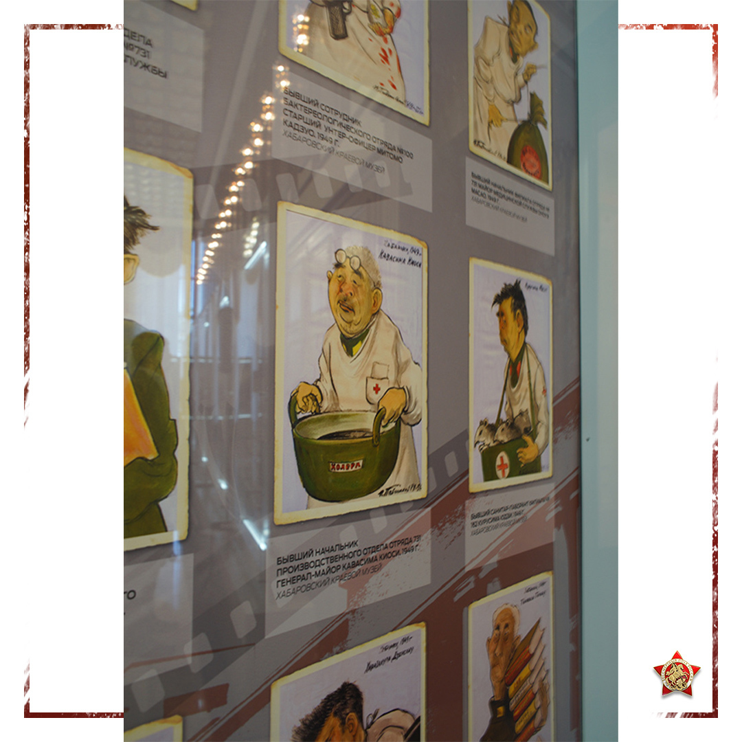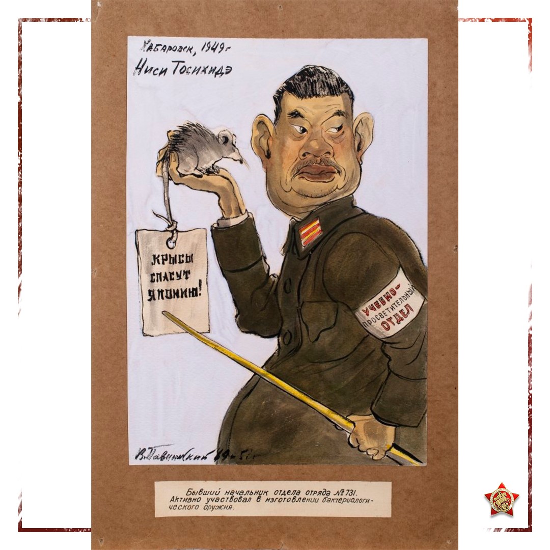 Точными, острыми штрихами он набрасывал на бумагу лица нелюдей, готовивших миру бактериологическую катастрофу. Работа продолжалась и после приговора, и растянулась на долгие месяцы. Результатом зарисовок, сделанных им в зале суда, стала галерея из 12 портретных карикатур японских военных преступников. Так бывший начальник отдела преступного отряда №731 Киоси Кавасима, руководивший выращиванием бактерий, изображен в белом халате, надетым на военную гимнастерку, в руках держит зеленый чан с темной жидкостью, на боковой поверхности надпись «холера». Бывший главнокомандующий Квантунской армии генерал Ямада изображён сгорбленным, в зеленой военной форме, на плече он держит большой шприц, с иголки которого капает жидкость, а из-под мышки торчит папка с надписью «бактериологическая война». Бывший научный работник Дзенсаку Хиразакура, принимавший участие в разведке на советской границе для изыскания наиболее эффективных способов бактериологической атаки на СССР, изображён с бутылкой черного цвета, из которого капает жидкость с надписью «бациллы сапа», а бывший начальник санитарного управления японской армии в Маньчжурии Рюдзи Кадзицука изображен с так называемой «фарфоровой бомбой», начиненной зараженными чумой блохами — ими японцы собирались бомбардировать Хабаровск, но просчитались.