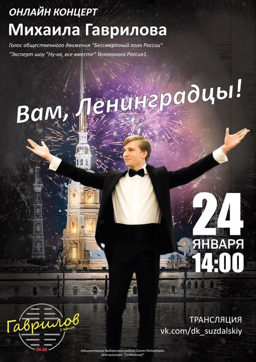 ? 24 января в 14:00 по московскому времени состоится онлайн-концерт Михаила Гаврилова — активиста Бессмертного полка России, которого многие уже знают, как «голос гражданско-патриотического движения». Концерт называется «Вам, Ленинградцы!», он посвящен Дню снятия блокады Ленинграда.