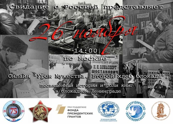 💻 В рамках Международного медиа проекта «Свидание с Россией» по инициативе Центра исторического добровольчества «Паруса истории» совместно с Некоммерческим партнёрством «КиТ» при поддержке Россотрудничества и Бессмертного полка России 26 ноября в 14.00 по московскому времени состоится онлайн-урок мужества «Второй хлеб блокады».
