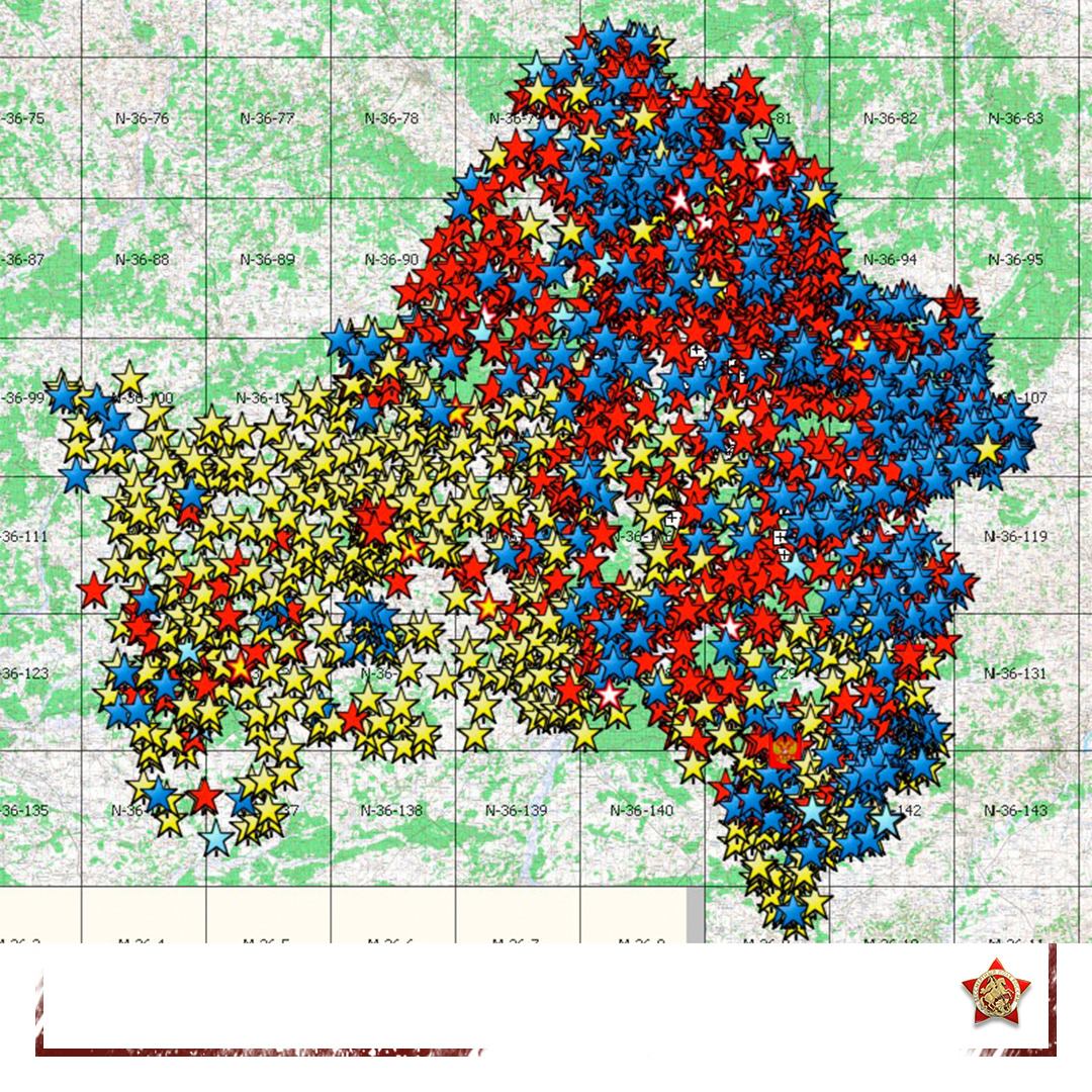 🗺 Это карта воинских захоронений и мемориалов Брянской области. Земля, на которой нет живого места, не опаленного, не выжженного войной. Каждая звездочка – чья-то братская могила или скромный одиночный памятник. 65 тысяч красноармейцев и партизан, погибших в боевых сражениях, умерших от ран и болезней. Почти 49 тысяч замученных в немецких концентрационных лагерях. Более тысячи воинских захоронений.