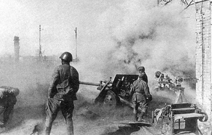 Орудийный расчет пушки ЗиС-3 лейтенанта Сухачева ведет огонь по врагу. Осень 1942 г., Сталинград.