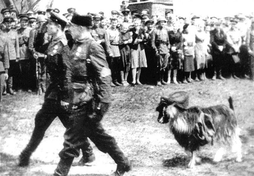 В одной из колонн партизанской бригады «Народные мстители» шел... седобородый козел в фуражке немецкого офицера. Выглядел он довольно занятно: на груди «красовались» немецкие ордена и медали, на левом боку висела ракетница, на правом — санитарная сумка. Завершали образ большие очки. Нарядное парнокопытное сняла тогда военная кинохроника, благодаря чему рогатый участник парада попал в историю, как говорится, на века.