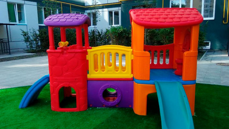 - Игровые комплексы рассчитаны на возможность проведения разноплановых игор: от лепки фигурок в песочнице до катания на горках или качелях. Домики и навесы позволяют ребенку весело проводить время в любую погоду.