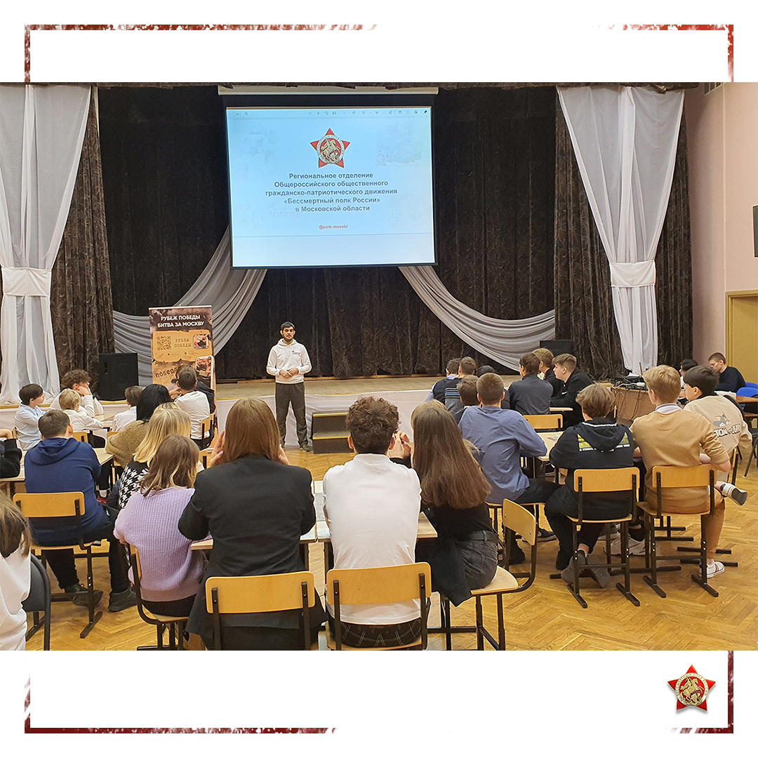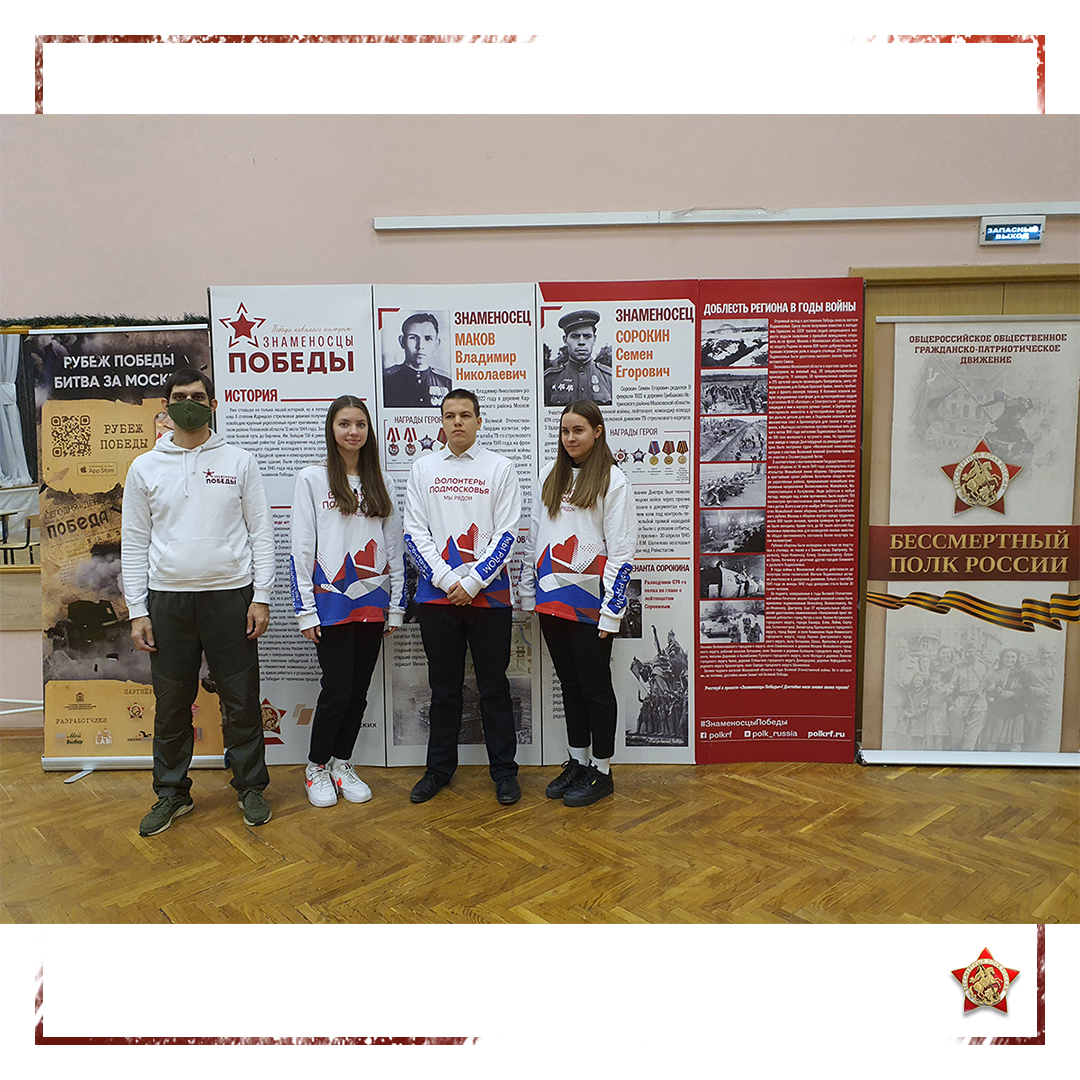 Для учащихся школ были организованы интерактивные уроки, которые включали в себя игру-викторину и виртуальное водружение Знамен Победы. Данные мероприятия вошли в цикл совместных мероприятий регионального отделения Бессмертного полка России и Главного управления социальных коммуникаций Московской области и посвящены 80-летию Битвы за Москву и контрнаступления Красной Армии. Как всегда, помощниками в проведении мероприятий выступили юные Волонтеры Подмосковья.