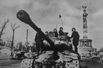 На фото: советские танкисты на броне тяжелого танка ИС-2 у колонны Победы в Берлине.
