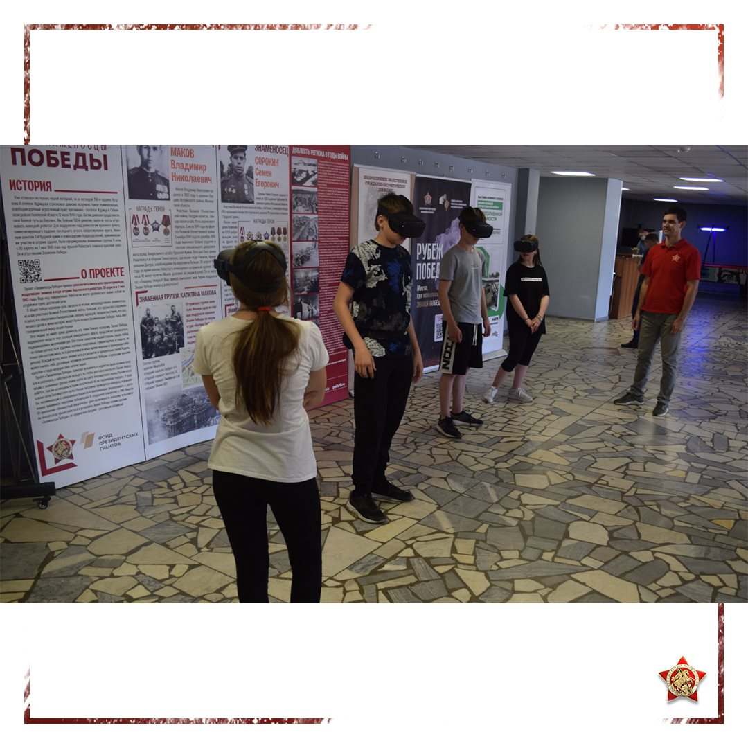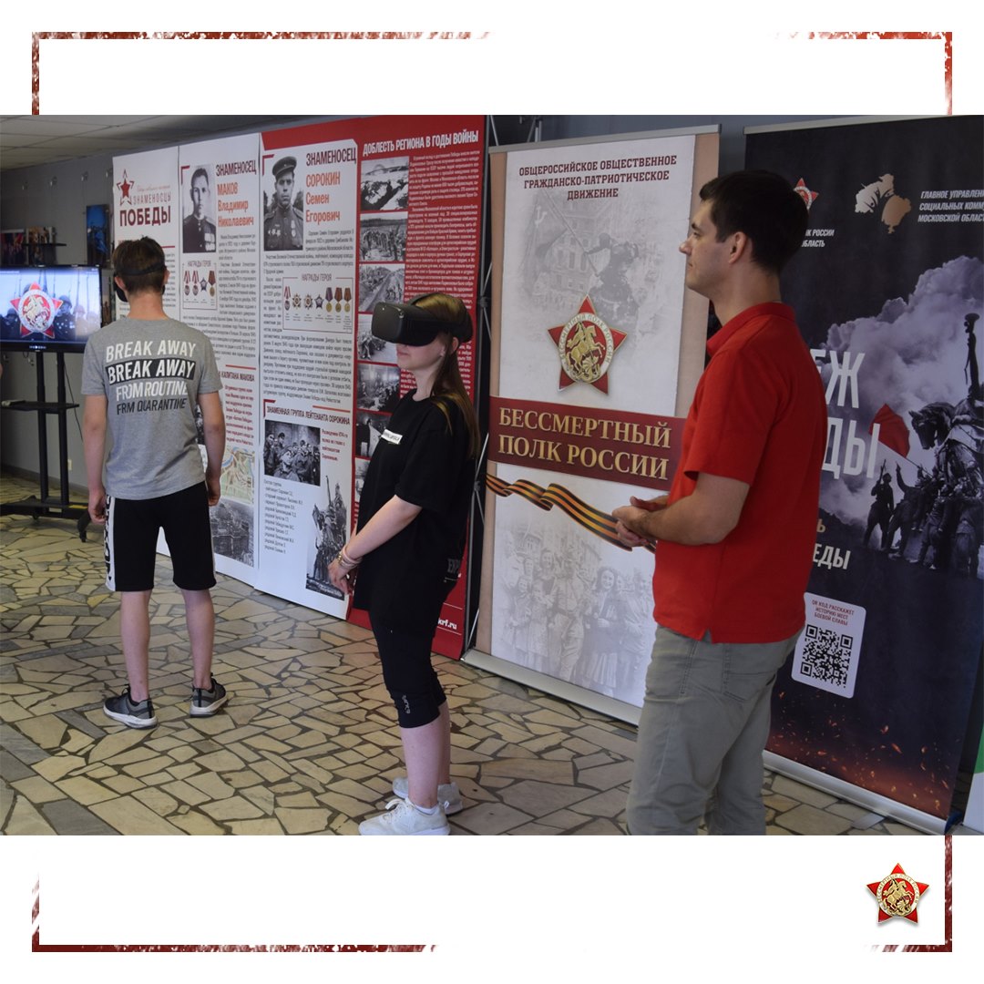 🕶 А выставка «Знаменосцы Победы» благодаря приложению для VR погрузила ребят в обстановку военного времени. Они ощутили себя в роли знаменосцев: побывали на крыше Рейхстага и водрузили Знамя Победы, как делали это их земляки 30 апреля 1945 года — уроженцы истринской земли лейтенант Семен Сорокин и капитан Владимир Маков.